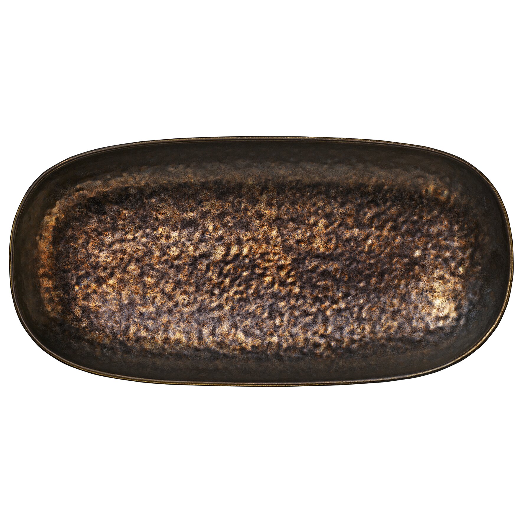 Die gehämmert wirkende Speisefläche in aufregendem Braun-Kupfer-Metallic machen die Nivo Metallic Platte tief 30cm zu einem aufsehenerregenden Tischbegleiter. Zeige deine Kreationen auf dieser extravaganten ovalen Steingut Platte und beweise Mut zum Besonderen. Moderne Speiseplatte in Kupfer-Optik und robuste Stoneware.