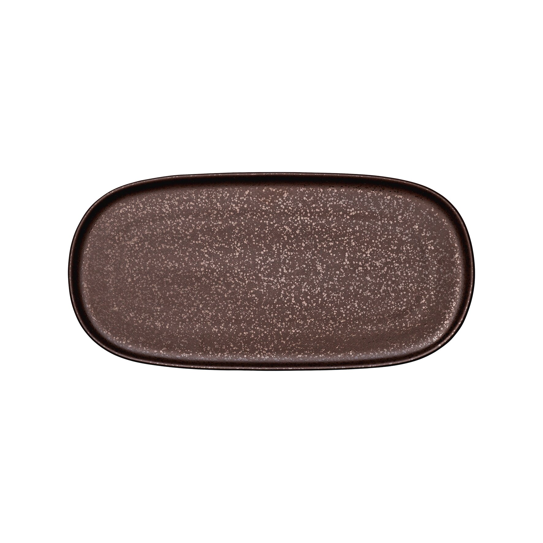 Ihre dunkle Farbe sowie die braun-gold-gesprenkelte Speisefläche machen die Nivo Mokka Platte flach 30cm zu einem Hingucker auf deinem Restauranttisch. Zeige deine Kreationen auf dieser extravaganten ovalen Platte und beeindrucke mit deinem Stil-Gefühl. moderne Speiseplatte in Gold-Braun robuste Stoneware